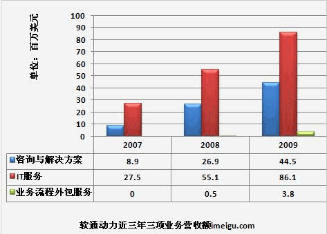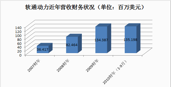 軟通動力的收入從2007年的3642萬美元大幅增長到2009年的34億美元,年復(fù)合增長率為92.15%。2010財年前九個月,軟通動力的收入達(dá)到1.35億美元,超過了2009年全年的收入。