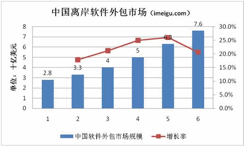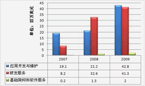 中國IT服務(wù)企業(yè)承擔(dān)的離岸IT服務(wù)項目主要是軟件外包。這些業(yè)務(wù)包括應(yīng)用程序開發(fā)和管理、產(chǎn)品開發(fā)、包裝解決方案服務(wù)、全球化和本地化服務(wù)等。這些客戶包括外國公司和外國公司在中國的分支機(jī)構(gòu)/子公司。中國的離岸軟件外包市場近年來也發(fā)展迅速。根據(jù)IDC 2010年7月的報告,中國離岸軟件市場規(guī)模將從2009年的28億美元增長到2014年的76億美元,年復(fù)合增長率為22.4%。