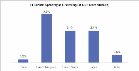根據(jù)IMF調(diào)查公布的數(shù)據(jù),中國2009年實際GDP增長率為8.5%,2010年將增長9%,是世界上增長最快的國家。然而,中國在 IT 服務(wù)上的支出仍然相對較低。根據(jù)調(diào)查數(shù)據(jù)和國際貨幣基金組織公布的數(shù)據(jù),2009年中國IT服務(wù)支出GDP僅為0.2%,而英國為3.2%,美國為< @2.1% 在同一時期。, 2.1% 代表日本,0.5% 代表印度。也可以看出,中國IT服務(wù)市場還有很大的增長空間。