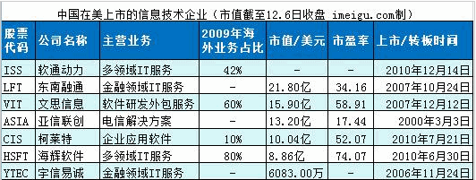 目前,軟通動力等多家中國信息技術(shù)公司已在美國上市。以下是各大公司的主營業(yè)務(wù)、上市時間及市值、市盈率等。