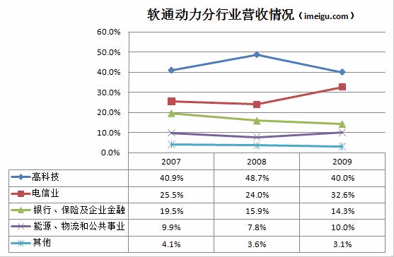 這些行業(yè)中,高科技行業(yè)占比最大,主要來自微軟、IBM等大型企業(yè)集團(tuán)的軟件分包項目;這些客戶也是軟通動力最賺錢的客戶。2007年、2008年和2009年,來自高新技術(shù)產(chǎn)業(yè)的收入占軟通動力總收入的40%以上。