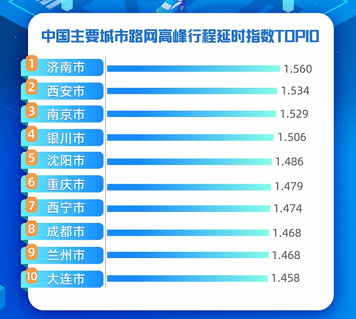 高德交通大數(shù)據(jù)監(jiān)測的50個(gè)城市中,2020年一季度中國擁堵延誤指數(shù)最高的十個(gè)城市分別是:濟(jì)南、西安、南京、銀川、沉陽、重慶、西寧、成都、蘭州、大連。其中,濟(jì)南路網(wǎng)高峰出行延誤指數(shù)為1.56,平均時(shí)速僅為31.79km/h。